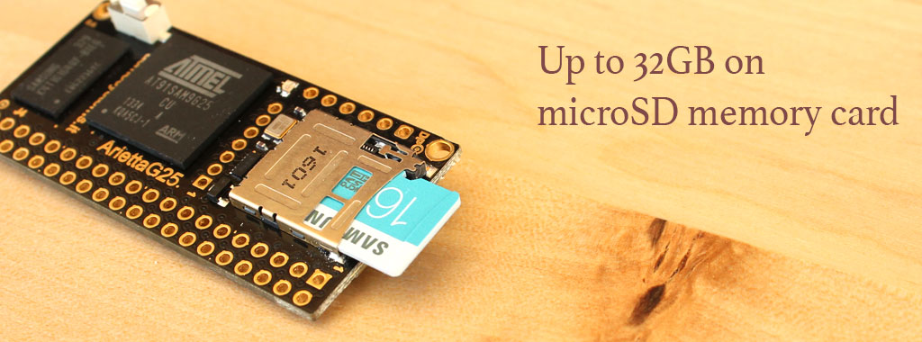 Caratteristiche Principali : CPU: Atmel AT91SAM9G25 SoC (ARM9 a 400 MHz). RAM: DDR2 128 MByte. Alimentazione: singola a 3,3 Vcc. Livelli digitali: TTL 3,3V (non tollera i livelli a 5V). PCB a 8 layer. LED e pulsante configurabili dall'utente. Disponibilità garantita: > 5 anni Progettata e realizzata in Italia. Connettore J4: Si tratta di una fila di piazzole dorate predisposte per accogliere un connettore THT da due file di 20 pin di passo 2,54 mm (100 mil). In alcuni casi piu' funzioni insistono sugli stessi pin che devono essere configurati con il processo guidato via web, nel file acme-arietta.dtb, nella partizione di root. Di conseguenza, le funzioni descritte di seguito non sono tutte disponibili contemporaneamente: - 1 USB host. - 1 USB host high-speed (condivide le linee della porta microUSB). - 1 USB host hi-speed (condivide le linee dell'adattatore WiFi). - 3 linee UART. - 2 Bus. - Bus SPI: 1 bus con la possibilità di selezionare fino a 3 chip (da 5 a 50 MHz). - 4 uscite PWM. - Convertitore ADC a 4 canali con 10 bit di risoluzione (1024 passi). - Interfaccia audio SSC/I2S. - non sono presenti uscite video o per display TFT ma e' possibile utilizzare il bus SPI per piccoli display TFT e il bus I2C per piccoli display LCD alfanumerici. - non e' presente un'interfaccia LAN diretta ma le porte USB possono essere usate per collegare un adattatore USB/LAN. Connettore DP: e' una fila di piazzole predisposta per accogliere un connettore maschio THT da 6 pin di passo 2,54 mm (100 mil) per collegare il convertitore USB/Seriale DPI (Debug Port Interface). Connettore WiFi: Piazzole predisposte per accogliere un connettore femmina da 7 pin di passo 2 mm per collegare l'adattore WiFi IEE802.11 b/g/n. Alloggiamento per micro SD: Accetta SD card fino a 64 GB di capacità con la configurazione GNU/Linux (bootable). Connettore micro USB: Permette di collegare la scheda Arietta G25 al PC ed accedere al sistema. La porta si presenta come un emulatore LAN su USB (USB gadget). Caratteristiche software: - Versione Kernel Linux 3.14.7. - Distribuzione: EmDebian Grip Linux Wheezy 7.4. Programmabile utilizzando pressoche' ogni linguaggio: C, C++, Python, Java, PHP, Perl, Node JS, Lua, Basic, Shell. GNU C, Python, Perl and PHP preinstallati nella distribuzione su microSD per un utilizzo immediato. IDE Codiad con interfaccia web per editare i progetti ed i programmi direttamente via Browser. Emulatore di terminale con interfaccia web Shell-in-a-box per la gestione remota del sistema da linea di comando.